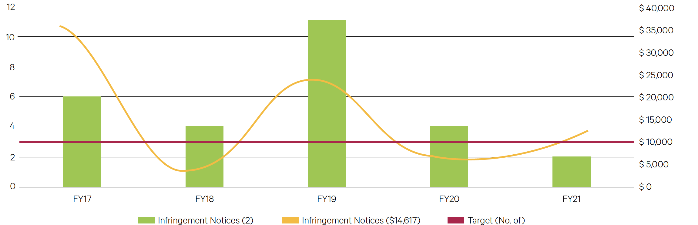 In FY21, Downer incurred one penalty infringement notice for environmental breaches which was an improvement on Downer’s performance over the past five years.