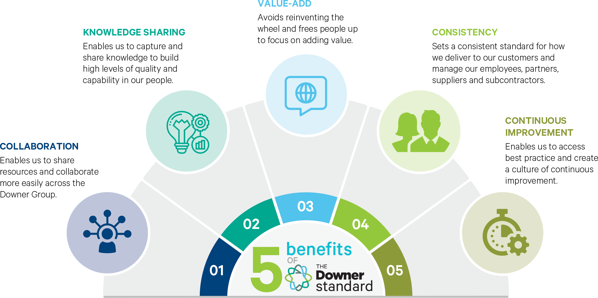 The Downer Standard project commenced in 2018, with the aim of delivering five key benefits across the Group: consistency, collaboration, value-add, knowledge sharing and continuous improvement.